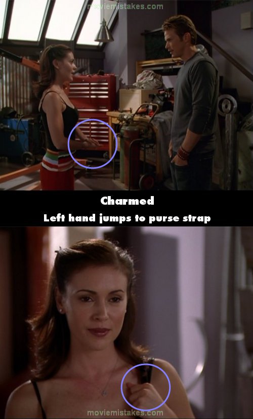 Continuity mistake: When Phoebe and Cupid visit the memory of Phoebe revealing she is a witch to Dex, past-Phoebe has her hands down by her sides, but then her left hand suddenly jumps to her purse strap. Not only that, but in the original episode ("Rewitched"), Phoebe's hand remained on her purse strap the entire time. (00:11:05)