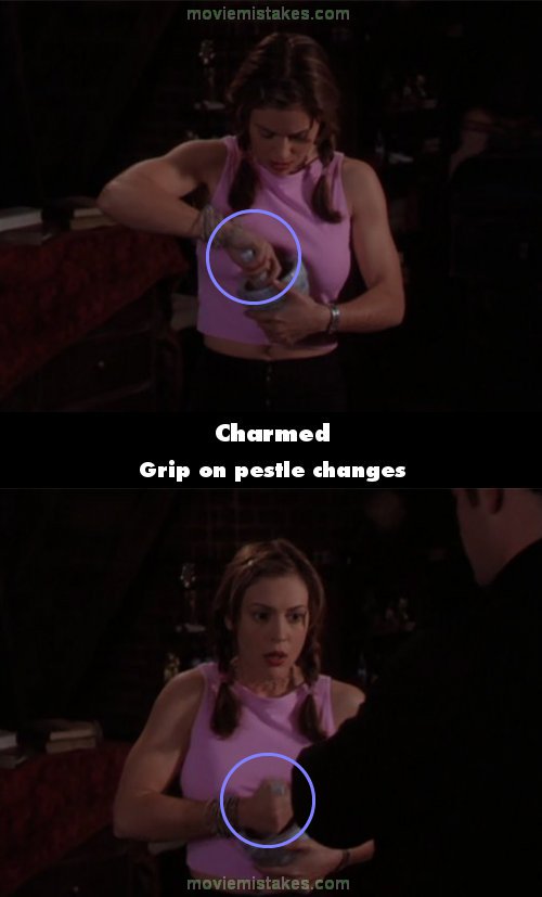 Continuity mistake: When Phoebe and Cole are talking about him going undercover into the Brotherhood, Phoebe's grip on her pestle changes back and forth between shots. (00:10:15)