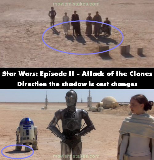 Continuity mistake: On Tatooine, after Anakin's mother died, and they laid her to rest, you notice the shadows of the tombstone's are all facing one direction. When R2-D2 comes over, you'll notice that his shadow is going in a different direction. Can't be explained by the two suns, as we've seen many times that they don't produce two distinct shadows. (01:27:45)