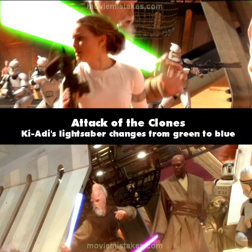 Continuity mistake: During the battle of Geonosis, Ki-Adi-Mundi has a blue lightsaber. After the clone army arrives, there is a shot of Obi-Wan and Mace, then Anakin, then Padme. During that shot of Padme, over her right shoulder, Ki-Adi can be seen with a green lightsaber. It then changes back to blue when he is on the transport ship deflecting laser shots. (01:56:50)