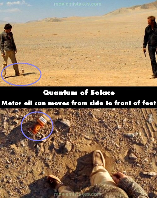Continuity mistake: At the very end, when Bond throws the can of motor oil at Greene, it first lands next to his left foot. The next shot from Greene's POV, looking down on the ground, shows that the can is now in front of his feet. (01:36:20)