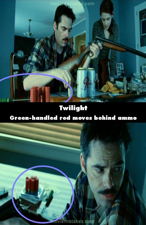 Continuity mistake: When Charlie is sitting at the table cleaning his rifle and Bella is talking to him, he places the cleaning rod (with the green handle) down on the table. In each different shot the rod is in a different place, either hidden behind the collection red ammo or not. (01:14:10)