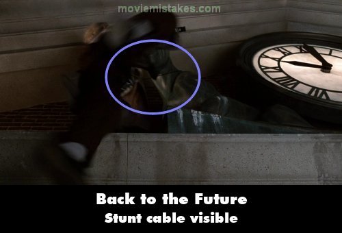 Visible crew/equipment: When Doc Brown loses his footing on the clock tower as it begins to toll, in the next shot, when he swings about towards the clock the thin black stunt cable attached to his waist, that leads around the neck of the statue, is visible. Do not confuse it with the thick silver electric cable Doc is holding. (01:35:25)