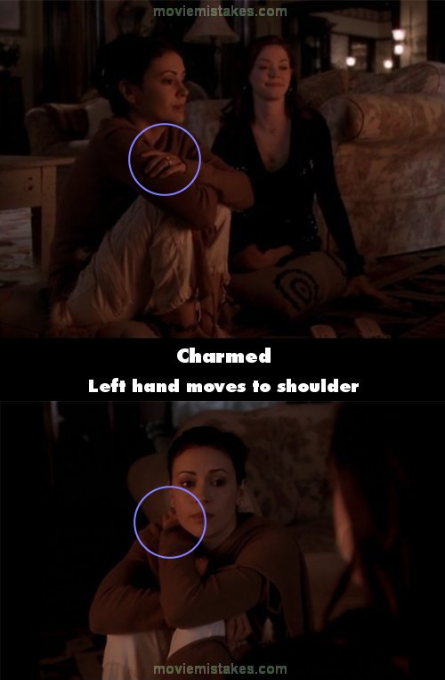 Continuity mistake: When Phoebe shows Paige her wedding ring, Phoebe's left hand moves from her right forearm to her shoulder. (00:27:00)