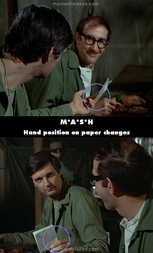 Continuity mistake: When Kaplan shows Hawkeye his travel orders about going home, Hawkeye holds the paper between his index and middle fingers, but in the next shot, he's holding them between his index finger and thumb. (00:06:00)