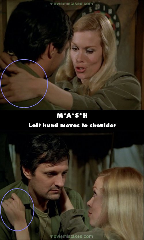 Continuity mistake: When Nurse Griffin talks to Hawkeye about the cease-fire, both of her arms are wrapped around Hawkeye's neck. In the next shot, her left hand is resting on his shoulder. (00:11:50)