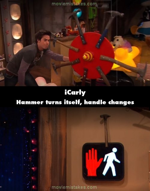 Other mistake: The "Fan of Hammers" has all the hammers pointed the same way. But when the hammer goes into the wall, it goes in backwards. It is also there through all the rest of the shows and even in season two, where in "iKiss" it has a black handle. (00:02:35)