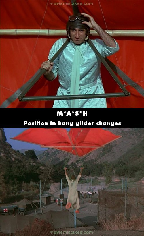 Continuity mistake: In the scene of Klinger trying to escape from the 4077 on a hang glider, he secures himself into the control frame, but then when he takes off, he's hanging off the frame's bottom bar. (00:10:40)