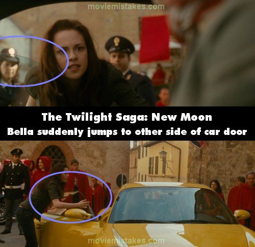 Continuity mistake: Bella goes to Italy to save Edward. Alice drops Bella off - when Bella gets out of the car to ask where Edward will be, first you see Bella in front of the car door, then she is suddenly behind the car door. (01:36:35)