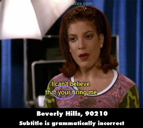 Other mistake: When Donna's boss fires her, she comments "I can't believe that you're firing me because...", but the subtitle reads "I can't believe that your firing me..." (00:20:50)