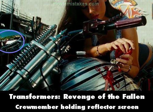 Visible crew/equipment: When Ron and Sam are discussing college and girls, in the shot facing Mikaela, as she's airbrushing the design on the motorcycle, the reflection of a crewmember (wearing a blue shirt) holding a reflector screen is visible on the chrome surface at the left, and as the camera pans in closer to her its moving shadow is also visible. (00:10:50)