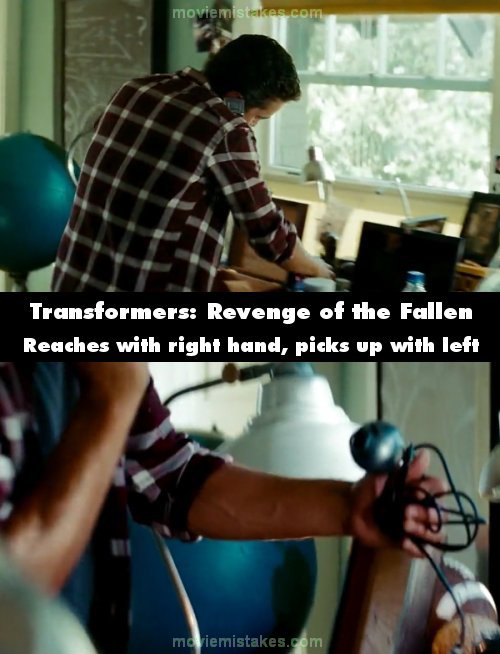 Continuity mistake: When Sam is on the cell with Mikaela, telling her about the long distance relationship kit, he reaches for the webcam with his right hand outstretched while holding the cell with his left, but in the close-up it's his left hand picking it up, while holding the cell with his right hand. (00:11:20)