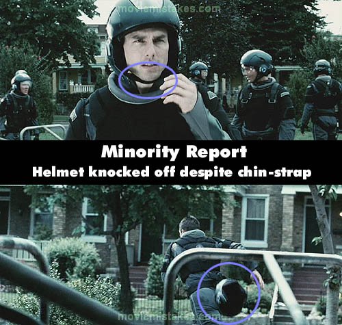 Continuity mistake: At the start, when John Anderton is going to arrest the man who can't see well without his glasses, he his trying to figure out which house the killer is in. While looking around, his helmet is fastened tightly around his neck, however, as he is racing off to the house he pulls the helmet off in a way which couldn't have been accomplished with the strap still fastened.
