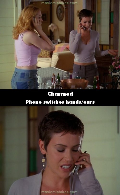 Continuity mistake: When Phoebe gets a phone call from Elise, Phoebe's phone changes back and forth from her right ear in the wide shots to her left ear in the closeups. (00:18:45)