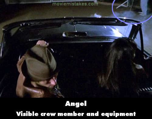 Visible crew/equipment: As Doyle, Angel and Cordelia back away in Angel's car from Russell's mansion, in the top right corner of the frame you can see a crew member's legs and a tripod.