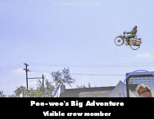 Visible crew/equipment: Near the end of Pee-Wee's chase scene at the Warner Bros. studios, he activates a launch mechanism on his bike and soars over a barb wire fence onto a roof. As he shouts "Geronimo," there is a crew member on the lower right hand side of the screen sporting a pair of sunglasses in front of a platform just staring towards the camera for a few seconds (best viewed on the matted widescreen DVD release). (01:17:05)