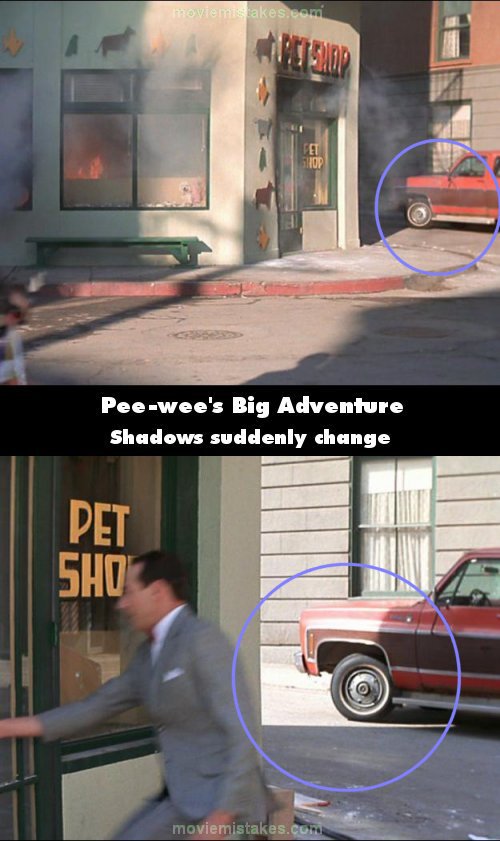 Continuity mistake: After Pee-Wee loses the Warner Bros. security crew on his tail, he sees a burning pet shop and decides to rescue the animals inside. Take a look at the early '80s red and black Chevy Suburban parked by the entrance. Whenever Pee-Wee runs outside, the amount of sunlight cast on the vehicle changes (sometimes lots of light, very little light or none at all) as though the scene were filmed at different parts of the day, then pieced together. (01:17:25)