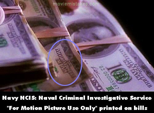 Revealing mistake: Gibbs finds a bunch of cash hidden in the victim's speaker. "For Motion Picture Use Only" is printed on them.