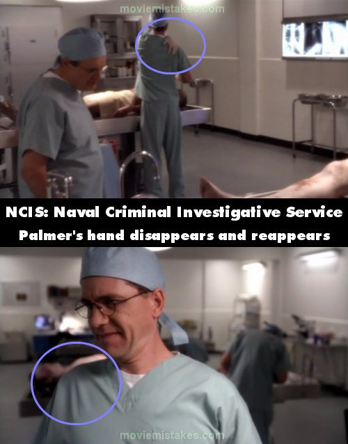 Continuity mistake: When Palmer and Ducky are in Autopsy and Palmer is scratching his itching back, his hand disappears and reappears over his shoulder. (00:07:40)