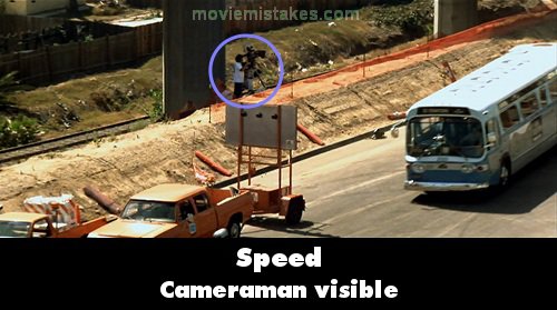 Visible crew/equipment: After Lieutenant McMahon requests to be flown to the 105 freeway interchange, a camera operator can be seen standing beside an overpass column when the bus and police escort drive by. (00:52:50)