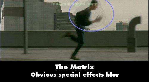 Revealing mistake: When it is Neo's turn to make the Jump he takes a run up, and the camera changes to a brief sideshot of him running across the top of the building with the sky behind him. There is a big fuzzy blobby outline around him which should have been edited out. (00:52:20)