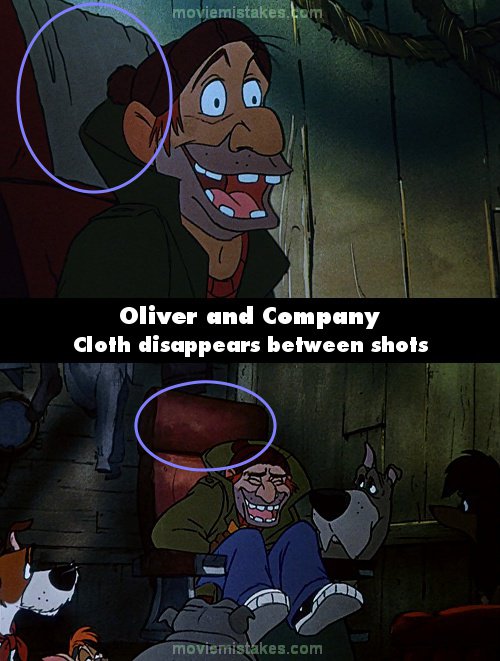 Continuity mistake: When Fagin sits in his recliner and comes up with the brilliant idea to exchange Oliver for ransom money, a white cloth draped over the recliner's headrest vanishes between shots. (00:48:25)