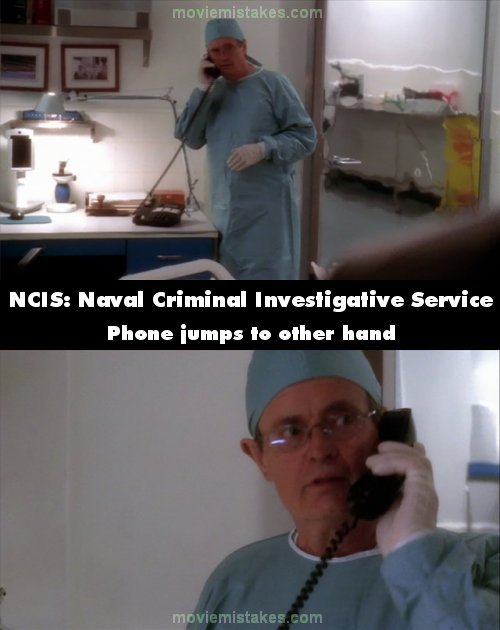 Continuity mistake: When McGee calls Autopsy looking for Gibbs, Ducky reaches for the receiver with his left hand, but then picks it up with his right. And during their conversation, the receiver jumps from one hand to the other between shots. (00:31:05)