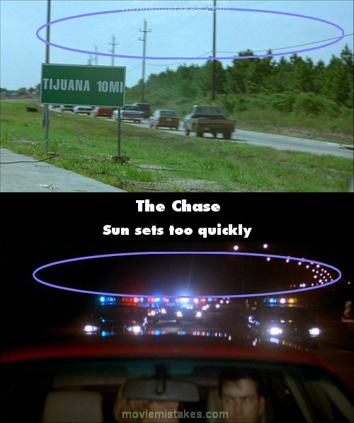 Continuity mistake: Just before Natalie and Jack have sex in the BMW it is blue sky outside, Jack sees the sign for the Mexican border being 10 miles away then the camera shows the speedometer reading 90mph, therefore they would be at the Mexican border in under 7 minutes (unless they went a different route which they wouldn't want to do because they are being chased by the police) however in the next scene presumably after the sex it is dark outside and they still have 1 mile left (approximately) till they reach the road block at the border, surely the sun doesn't go down THAT fast.
