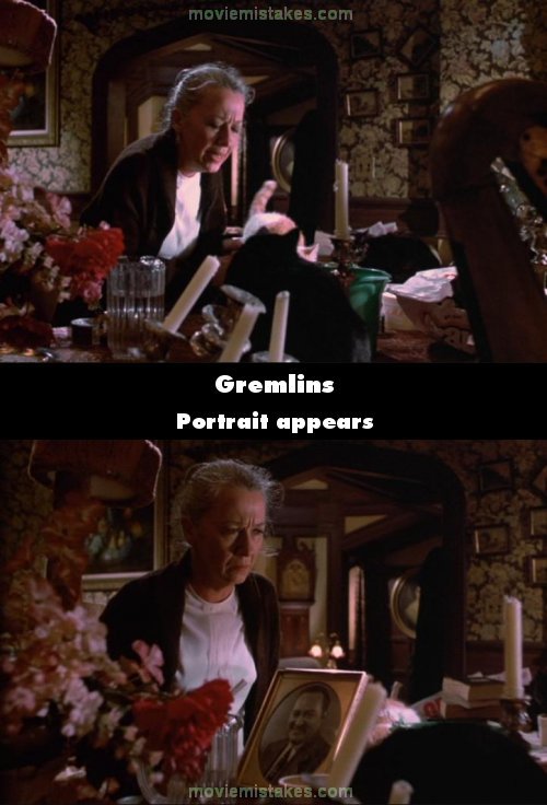 Continuity mistake: Before Mrs. Deagle is attacked a portrait appears on her table between shots. (01:08:25)