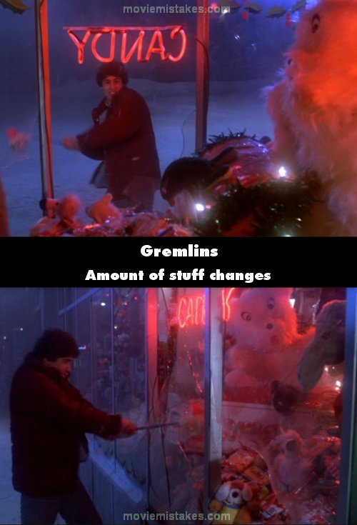 Continuity mistake: When Billy smashes the Candy store window the amount of stuff behind the glass changes between shots. (01:27:50)