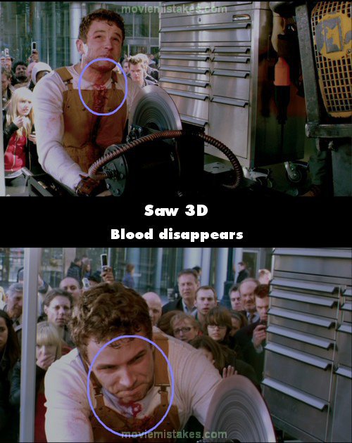 Continuity mistake: Brad gets blood all up his face when he is hit by the saw. When Ryan and Brad decided to let Dina die, the blood has gone from Brads face. (00:06:40)