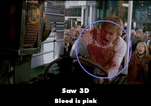 Revealing mistake: Most of the blood seen in this film is too light to be considered real human blood. In the public trap it is practically pink. The reason for this is the 3D effect. When watched in 3D, it looks more like normal blood. But in normal viewing, it does look too light. (00:06:00)