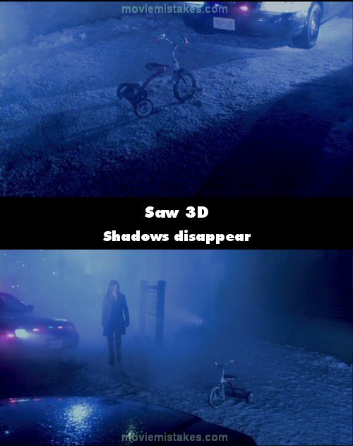 Continuity mistake: When Jill notices the trike there is a shadow by the bike. When the angle changes, the shadow has gone. (00:16:40)