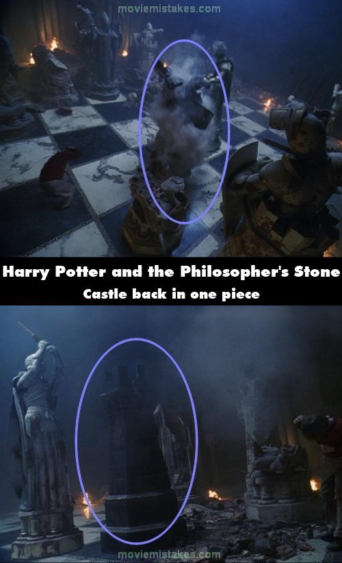 Continuity mistake: In the chess scene, at the end of the (overlong) montage of shots of pieces being smashed, the White Queen turns her attention to a Black Castle. The first stroke of her sword clearly goes through the structure of the castle, which disintegrates. We cut to various different angles and watch pieces of the destroyed castle flying all over the place. Cut back to the original angle, and we see the Queen attacking again, but the Castle is completely intact - only the figure from on top of it is missing. And it can't have been the second castle, since that's Hermione's position. (01:58:26)