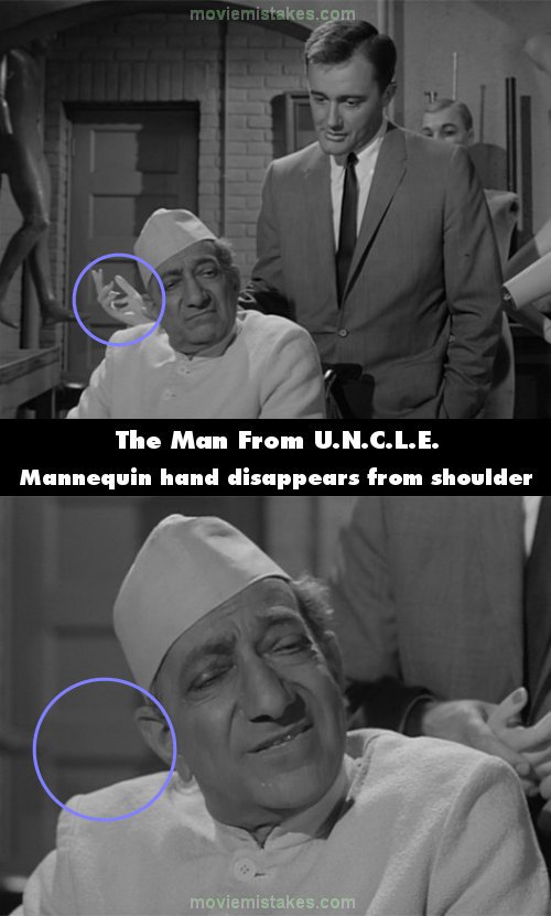 Continuity mistake: When Napoleon and Samoy are wondering if Thrush poisoned Waverly in order to deliver him to a specific medical clinic, the mannequin hand Solo has resting on Samoy's shoulder disappears between shots. (00:21:00)