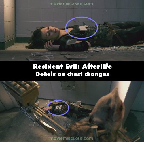 Continuity mistake: When Alice is knocked out by the Axeman, she lands on her back with a few broken tiles on her chest. When we get the far shot with the Axeman, there are suddenly a lot more tiles. (01:05:20)
