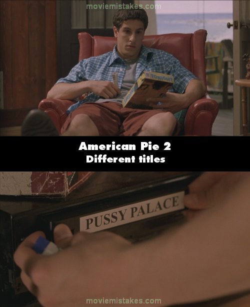 Continuity mistake: At the beach house when Stiffler is passing out the porn, he throws Jim a porno movie that has a different title than the one that gets glued to his hand. (00:54:45 - 01:01:00)