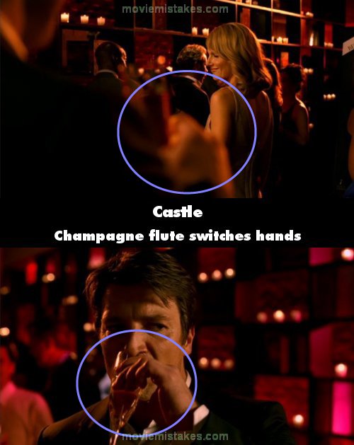 Continuity mistake: When Castle finishes talking to Gina about his new book that's due, he raises his champagne flute with his right hand, but when he actually imbibes the alcohol, the flute is in his left hand. (00:04:25)