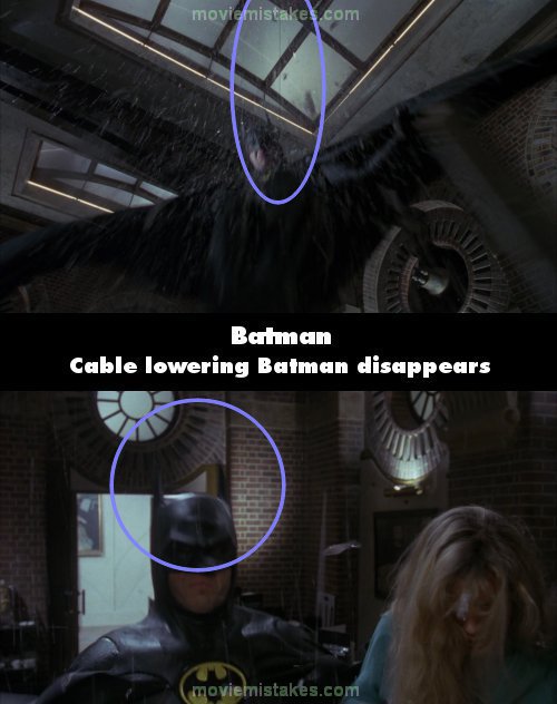 Visible crew/equipment: When Batman comes through the skylights in the museum just after Vicki throws water on Joker's face, you can see the stunt cable that lowers Batman down. Batman does use a system of cables and grappling hooks because he has no superpowers, but the cable lowering him down disappears as soon as he hits the ground. It was used to lower the actor down safely, not the character.