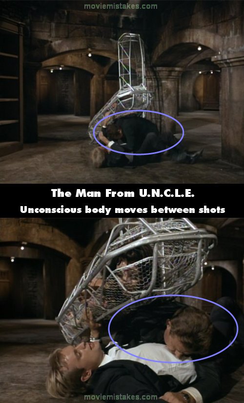 Continuity mistake: When Rosy knocks Olaf out during his fight with Illya, the position of Olaf's body on top of Illya changes between shots. (00:43:20)