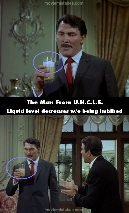 Continuity mistake: When Luger is assassinated for compromising Thrush's plans, the amount of liquid in Strago's glass decreases between shots, without Strago actually drinking anything. (00:15:05)