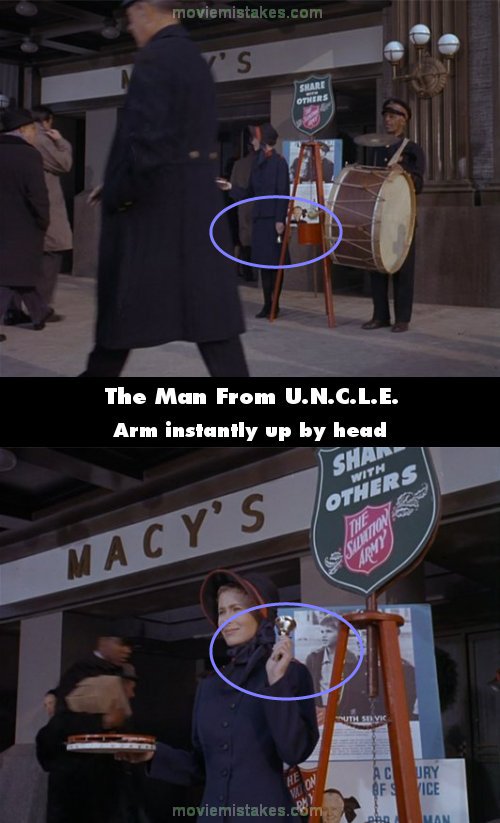 Continuity mistake: When Napoleon and Illya enter the Macy's store with the Russian chairman, the woman outside with the Salvation Army is ringing her bell down by her side, but when the shot cuts, the bell is up by her head. (00:09:05)