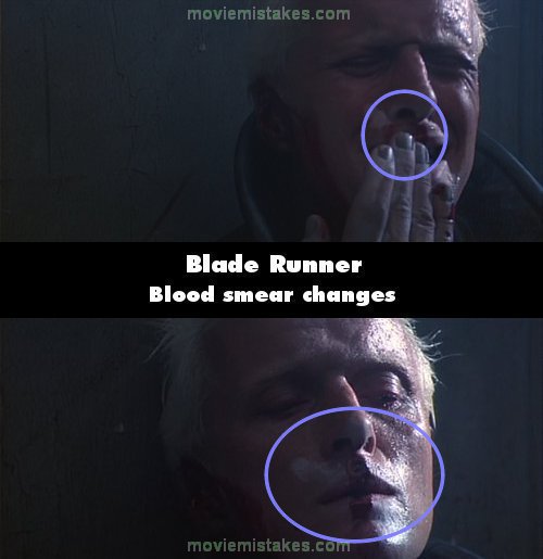 Continuity mistake: After he finds dead Pris, the blood smears on Roy Batty's lips change. He touches her bloody wound with the fingertips of his right hand and then presses them to his upper lip. You will see two parallel smears of blood. Moments later there is only one smear going from his upper lip all the way to his chin. (01:37:20)