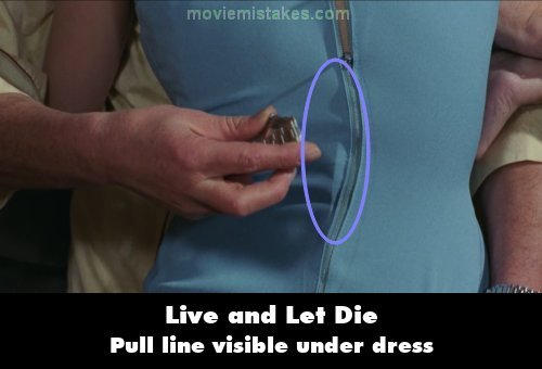 Revealing mistake: When Madeline Smith (The Italian agent credited as Beautiful Girl) emerges from the wardrobe / closet, she embraces Roger Moore. He then uses his magnetic Rolex to pull down the zipper on the back of her dress. If you look closely, you can see the cable/wire under dress pulling the zipper down. (00:12:20 - 00:12:00)