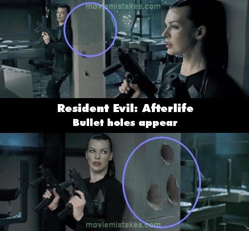 Continuity mistake: During the initial fight scene, one of the Alice clones takes cover behind a pillar, which is fully intact. When the shot cuts to show her and the other clone, there are three bullet holes that have mysteriously appeared in the pillar. (00:11:10)