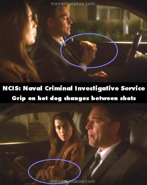 Continuity mistake: Episode 8x21, "Dead Reflection": When Tony and Ziva are staking out PO Donner's house, Tony's grip on the hot dog in his hand changes between shots. (00:11:40)
