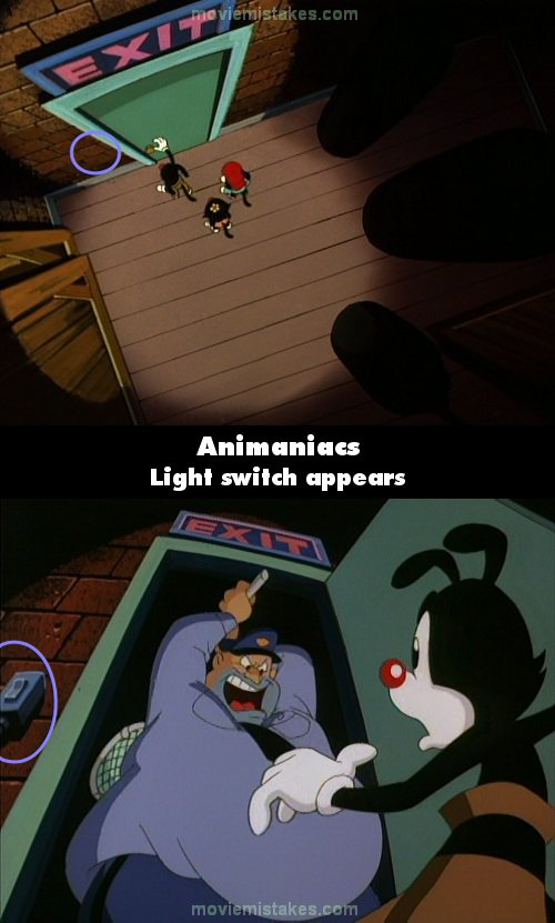 Continuity mistake: In the scene where Yakko is backstage at Carnegie Hall trying the exits for an escape route, he opens door number two and finds Ralph the Guard ready with a net. Notice how a light switch appears beside the door frame between shots.
