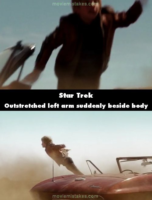 Continuity mistake: As young Kirk jumps out of the car, just before it crashes down into the canyon, his right arm is backwards along his body as it opened the door, while the left arm is stretched forward. In the following side shot, both his arms are stretched backwards. (00:13:50)