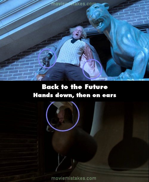 Continuity mistake: When the clock tower bell sounds a third time, Doc backs away from the ledge and stares down below in shock. Doc's arms are hanging down at his sides, but once the shot changes he's seen cupping his ears. (01:35:35)