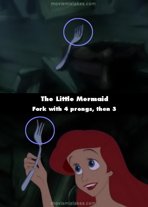 Continuity mistake: The first time Ariel sees a fork it has 4 prongs. When she grabs it it has 3. (00:07:25)